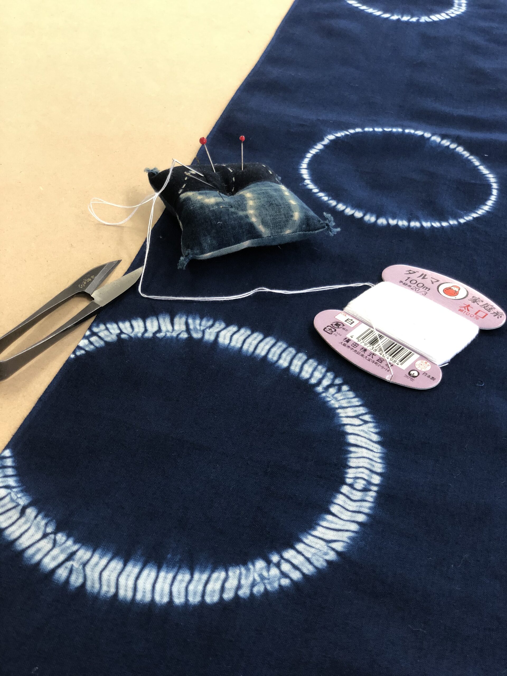 裁縫道具 針と糸を使い、縫い絞りをおこないます。 |